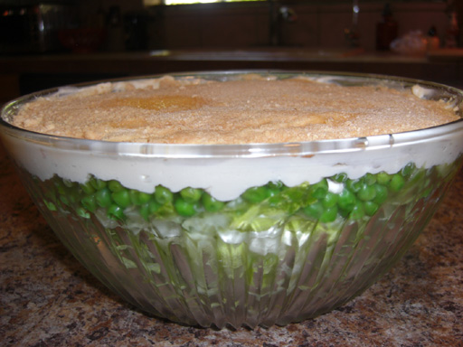 LAYERED PEA SALAD Great for social gatherings! Make the day before and toss just before serving. Layers of bacon, lettuce, celery, onion, water chestnuts and peas. Sealed with dressing and cheese. Yum! |