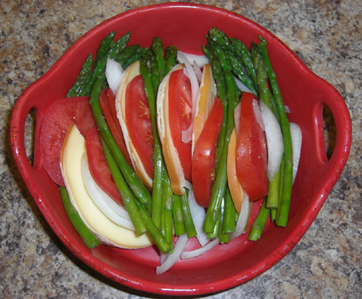 PROVOLONE ASPARAGUS SALAD Light and refreshing layered salad with slices of sweet onion, provolone cheese and beefsteak tomatoes, with spears of steamed asparagus. |